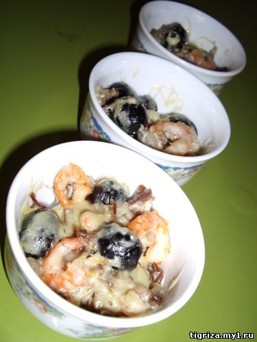 | Креветки по-французски 0,5 кг отваренных креветок , 0,25 кг отварного куриного мяса, 0,5 банки оливок, лимон , 100 г твердого сыра, карри, майонез. Отварить некрупные креветки и куринное мясо. Мясо нарезать тонкими полосками. Смешать, добавть оливки, по желанию заправить майонезом (можно сметаной), выложить на порционные тарелочки, посыпать тертым сыром и карри, сбрызнуть соком лимона. Перед подачей согреть в СВЧ или духовке, чтобы сыр расплавился. http://www.gastronom.ru/recipe.aspx?id=414