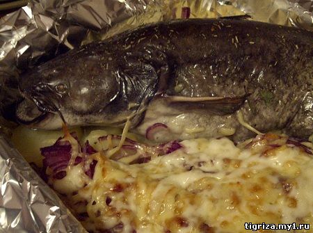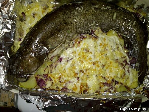 Берем сома (обычно он уже пощищен), моем, укладываем на фольгу, фаршируем: